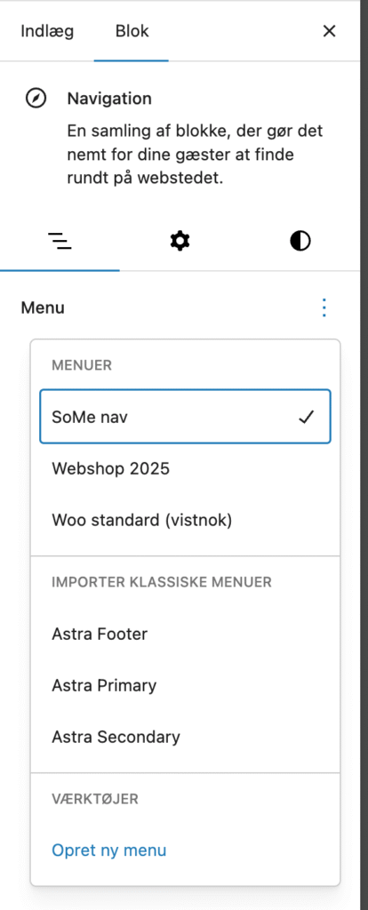 Når du får brug for en menu skal du placere markøren dér, hvor menuen skal være. WP vil indsætte en eksisterende menu; men du kan altid lave en ny menu.