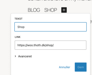 Derefter kan du tilføje de nødvendige sider til menuen, SoMe-links – eller eksterne links. Tilføj de sider, som du ønsker til menuen. I søgefeltet kan du indtaste nogen ord fra titlen, eller måske bruge ord som “katagori”. Prøv om du kan tilføje Woo sider og kategorier.