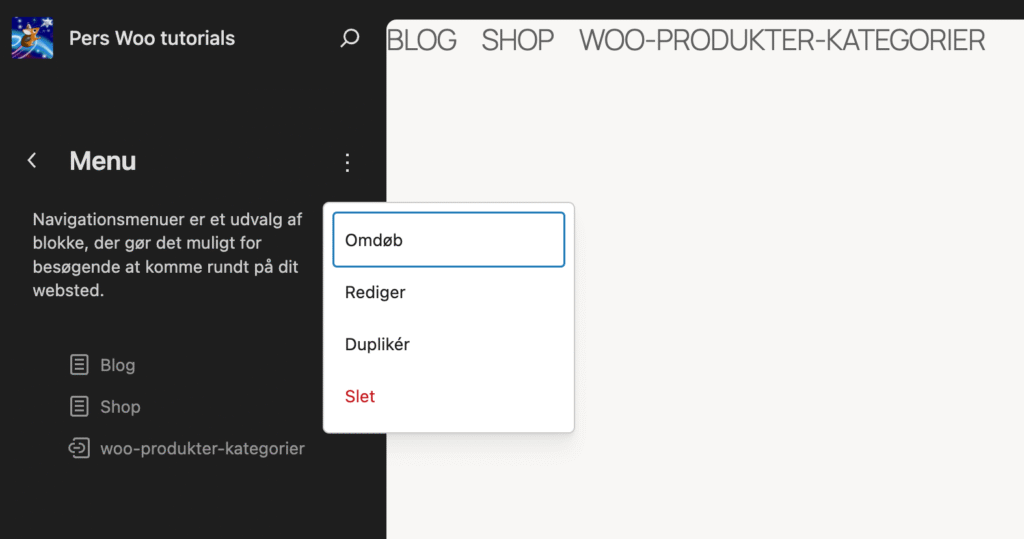 Her kan du se en liste med alle sitets menuer. Klik på menuen og omdøb den ved at klikke på ikonet med tre prikker.